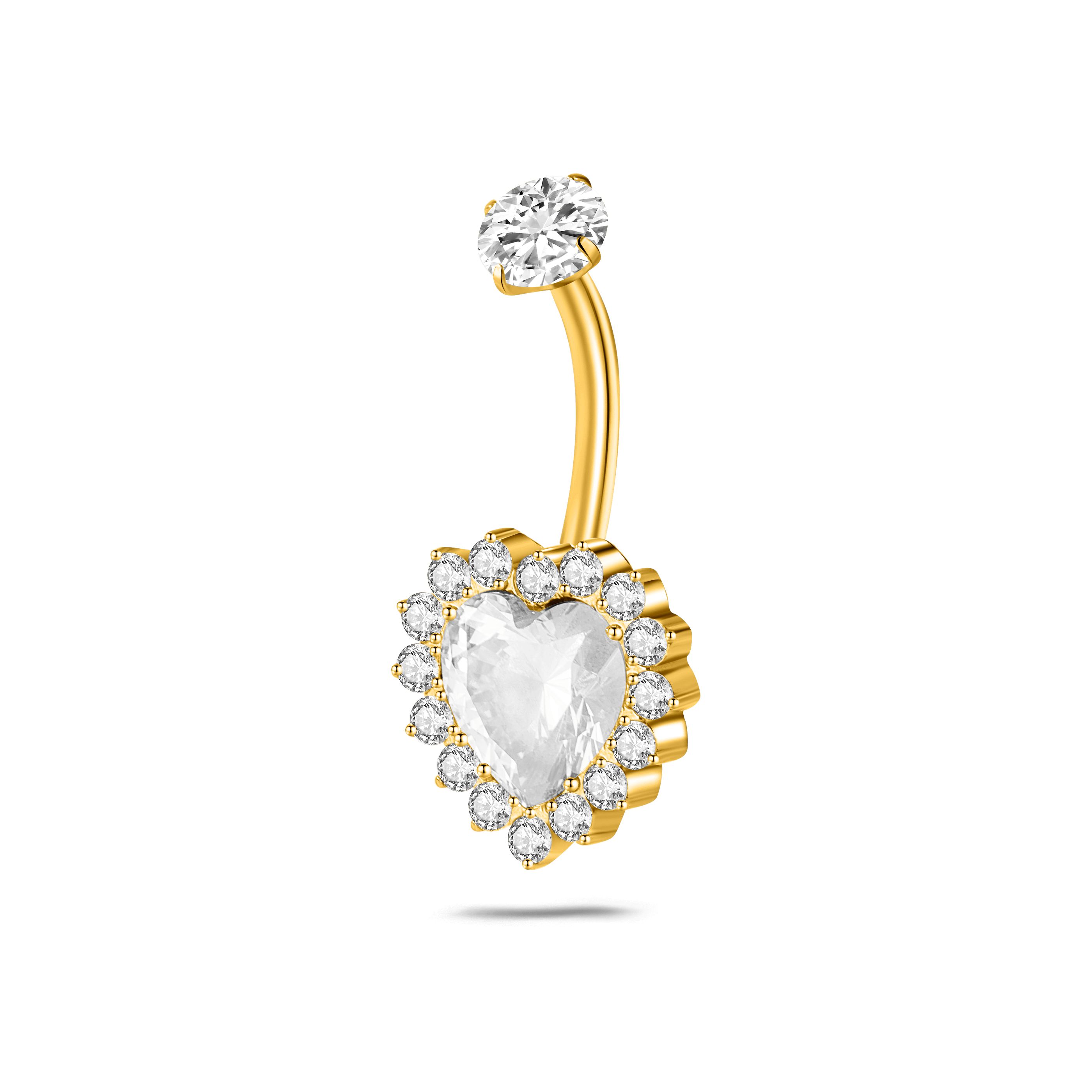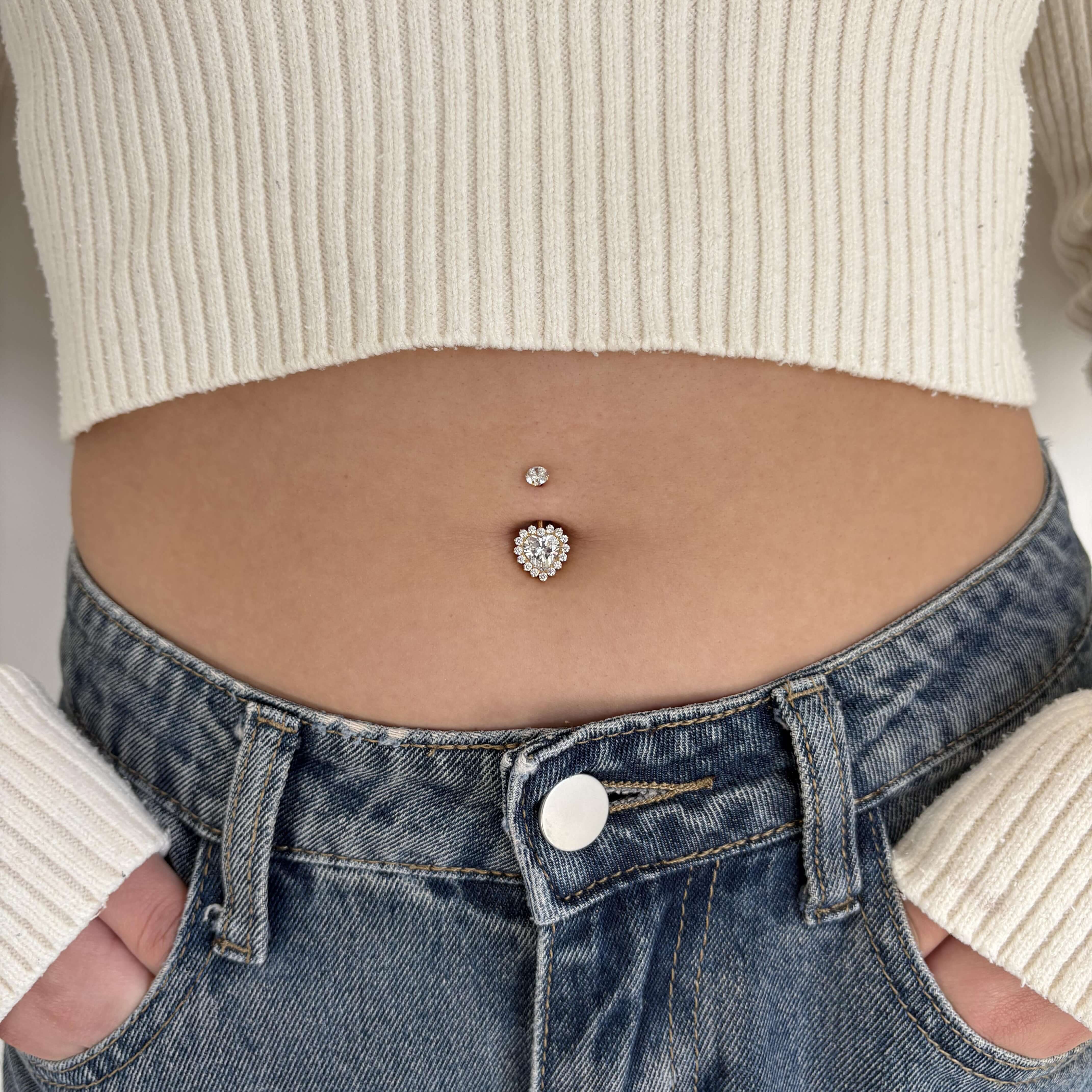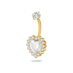 White heart belly button piercing in gold with white crystals